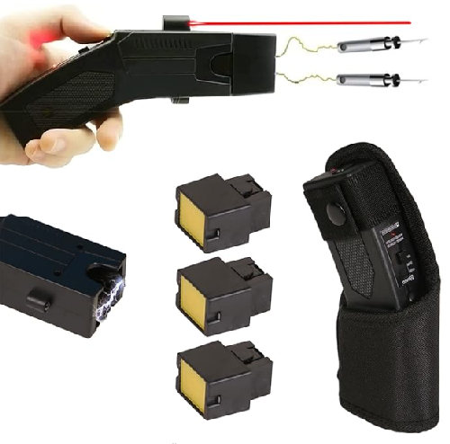 主机能产生8000KV高压,通过激光瞄准器瞄准目标,按动主机发射按钮,发射器射出两根探针,击中目标后输出80KV高压制服坏人。泰瑟枪型远程电击器输出电流严格控制在安全范围以内,没有生命危害性。泰瑟枪型远程电击器最佳发射距离为2.5 米一5米。本产品外形美观、体积小、重量轻、便于携带、符合射击原理,是人们防身的好工具。